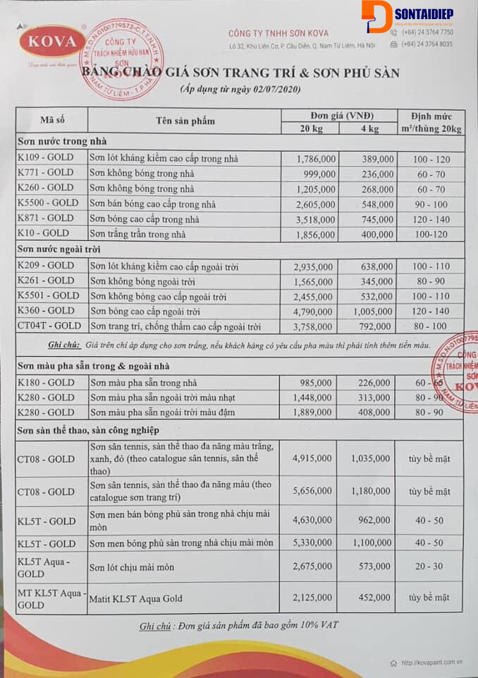 Báo giá sơn Kova 2020- Bảng giá niêm yết tiêu chuẩn của tập đoàn Kova áp dụng từ 02-07-2020